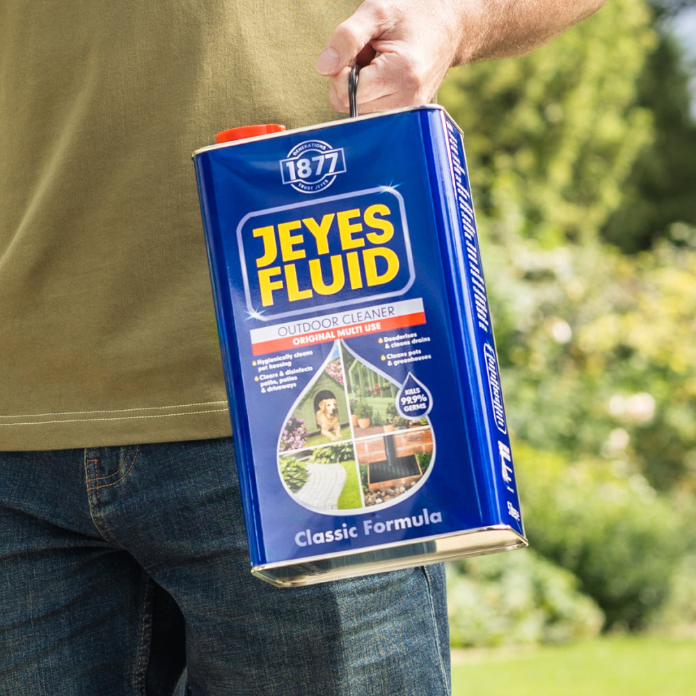 Jeyes Fluid is a powerful outdoor cleaner and disinfectant, ideal for cleaning patios, driveways, drains, greenhouses, garden furniture, animal housing, and more.
